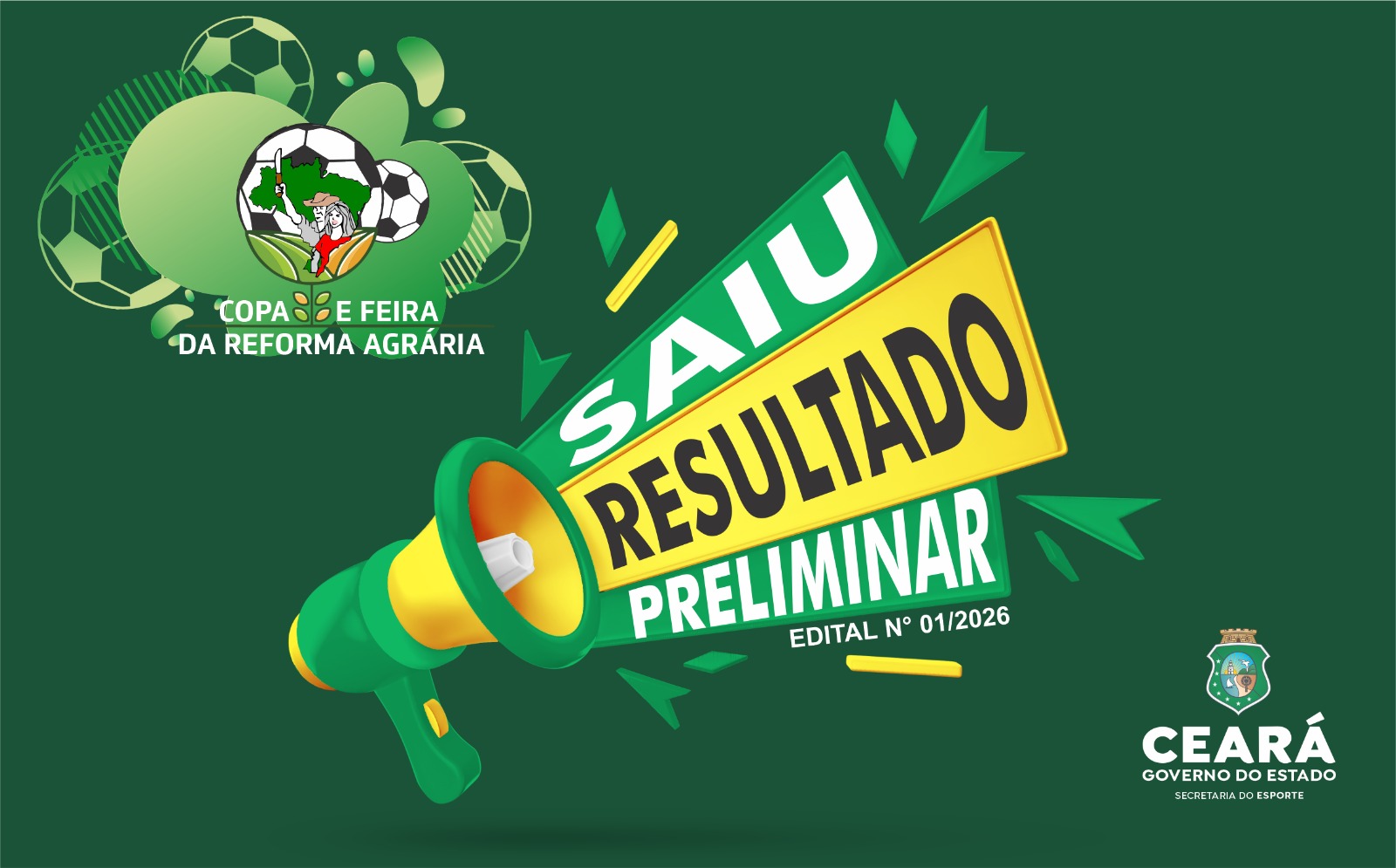 A Secretaria do Esporte (Sesporte) divulga, nesta segunda-feira (9), o resultado preliminar do edital Nº 01/2026 que diz respeito ao processo de Chamamento Público para selecionar a entidade executora do Projeto Copa e Feira da Reforma Agrária 2026.