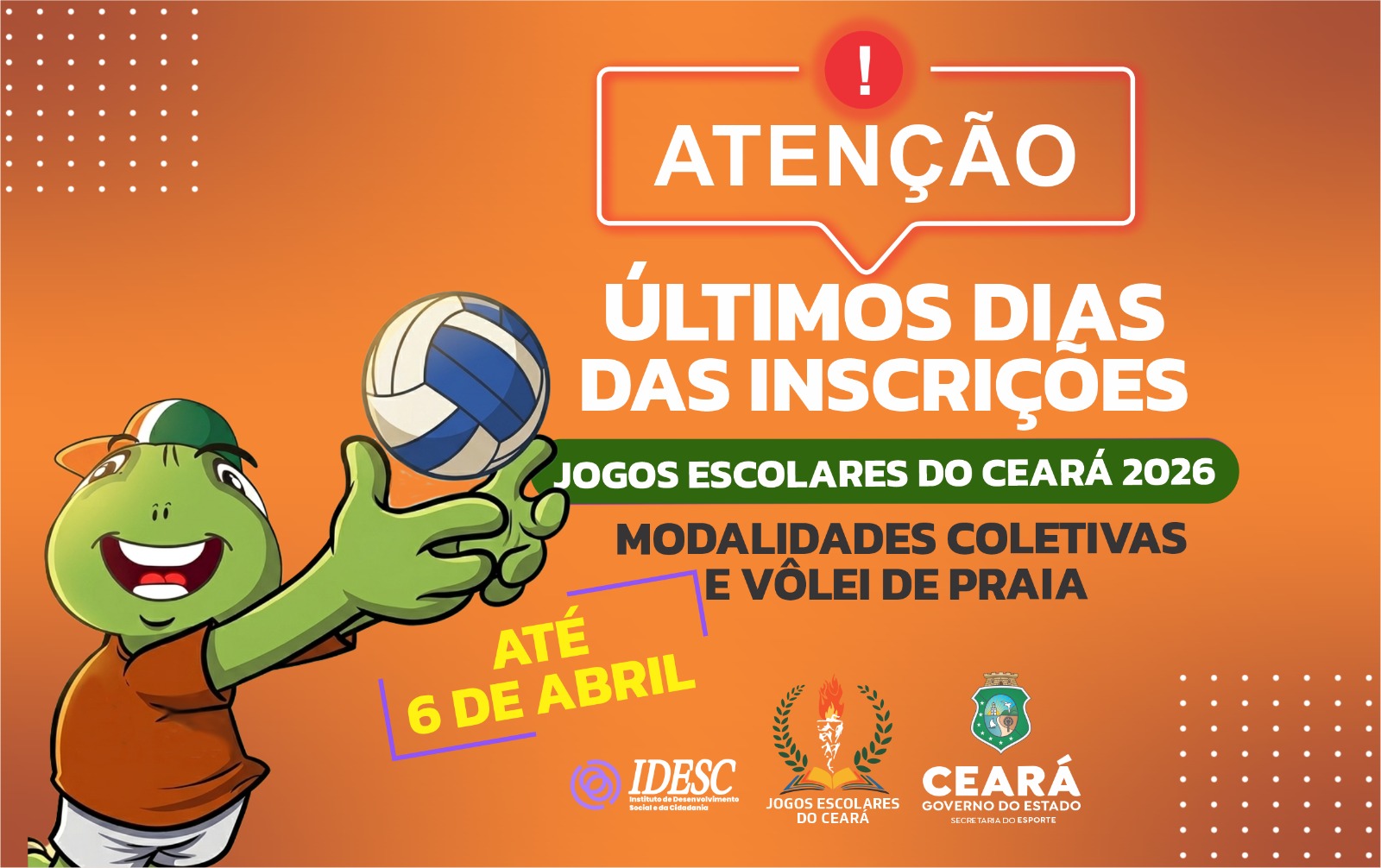 A Secretaria do Esporte (Sesporte) informa, que as inscrições para os Jogos Escolares do Ceará 2026, nas modalidades coletivas e vôlei de praia encerram no dia 06 de abril, nas demais modalidades individuais, as inscrições seguem até o dia 05 de maio.