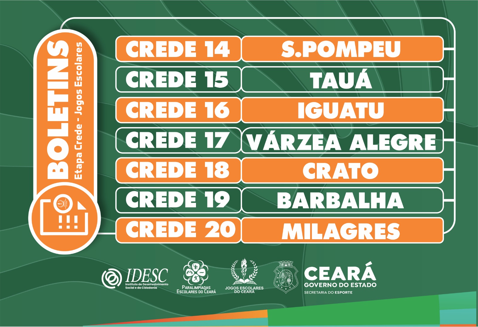 A Secretaria do Esporte (Sesporte) divulga, nesta quinta-feira (16), o boletim da fase Regional CREDE das modalidades coletivas (Futsal, Handebol, Basquete e Vôlei), dos Jogos Escolares do Ceará.